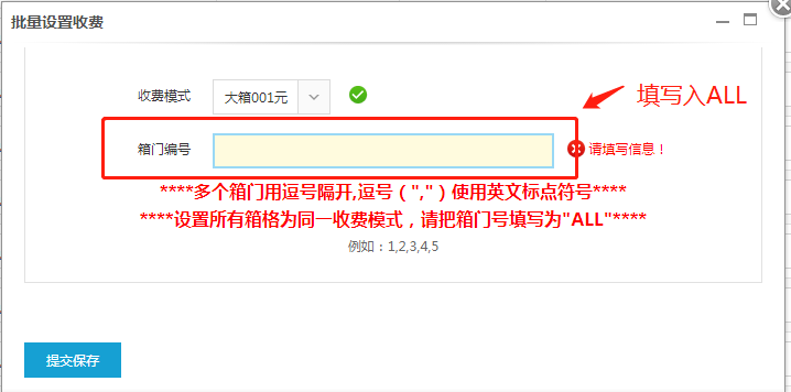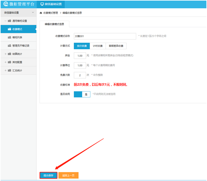 ○3 設置完之后“提交保存”即可(這里我們設置全部箱門收費模式為“大箱001