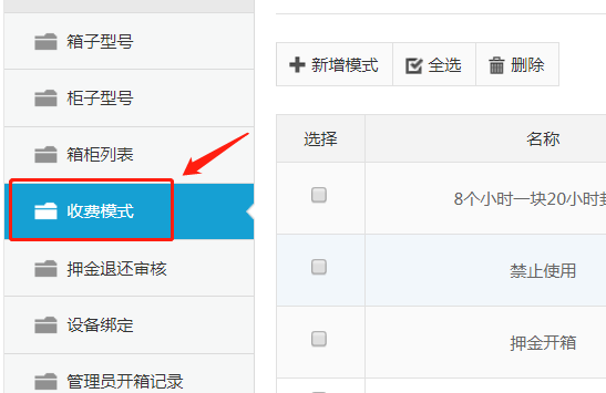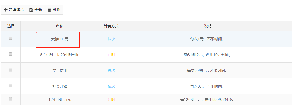 ○2 在彈出窗口選擇收費模式(以“大箱 001”為例),我們選擇收費模式