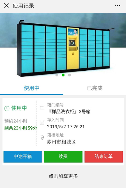 取物時,掃屏幕二維碼進入公眾號內,點擊“取物”按鈕(如圖1-3所示),點擊“取物”按鈕后,將出現(xiàn)如圖1-4所示界面,客戶可以根據(jù)需求點擊“中途取物”或者“結束訂單”,點擊“結束訂單”后,箱門打開,請取走所有物品。點擊“中途取物”后,此箱門還屬客戶,客戶還可以繼續(xù)存物或者取物。
