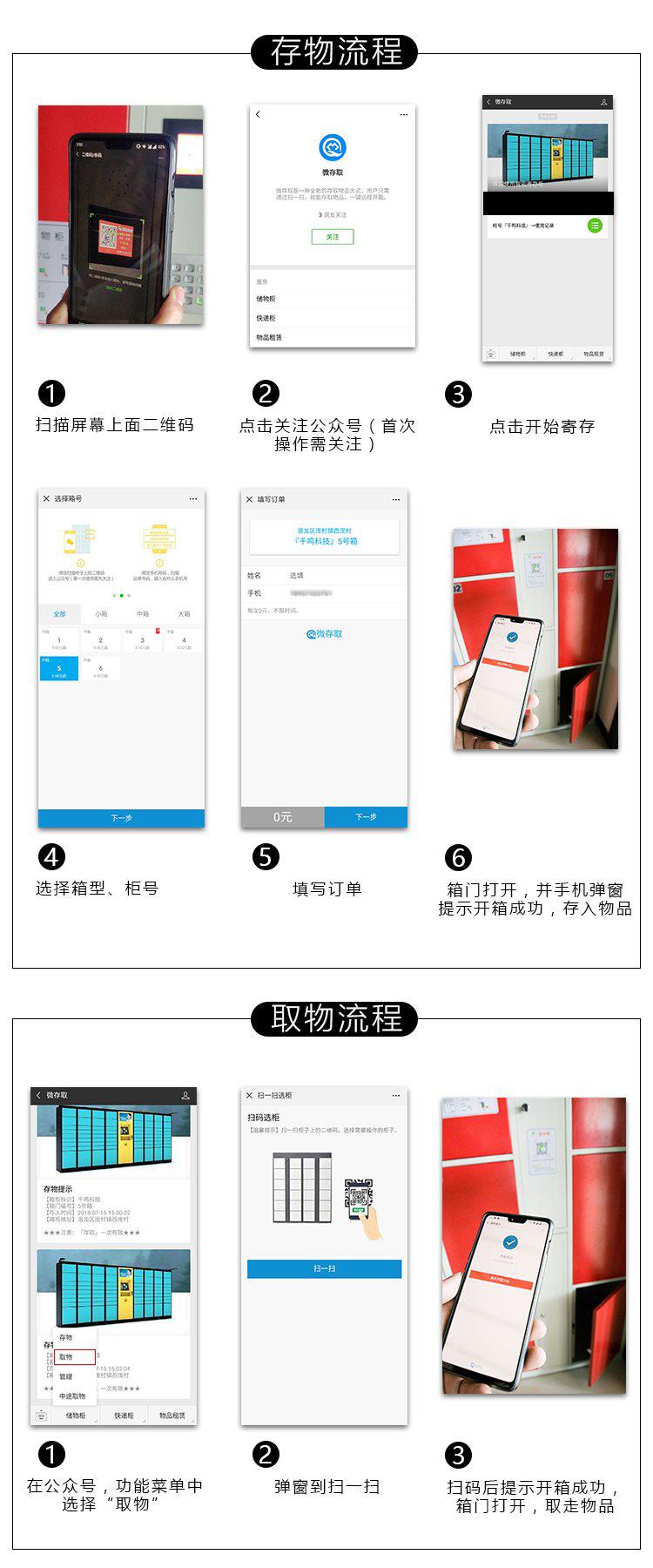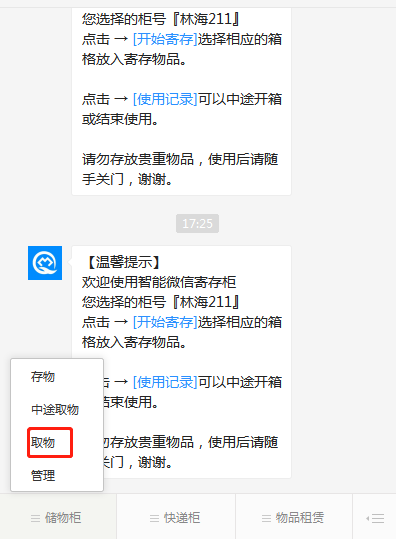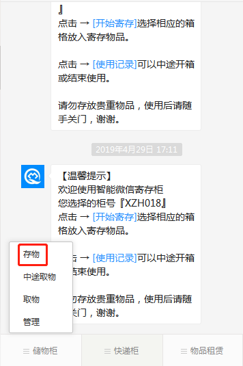 1)使用人在使用微信柜時,首次使用需打開微信掃一掃,掃屏幕二維碼碼關注公眾號,關注后進入公眾號內,點擊“存物”菜單(如圖1-1),掃碼選柜。