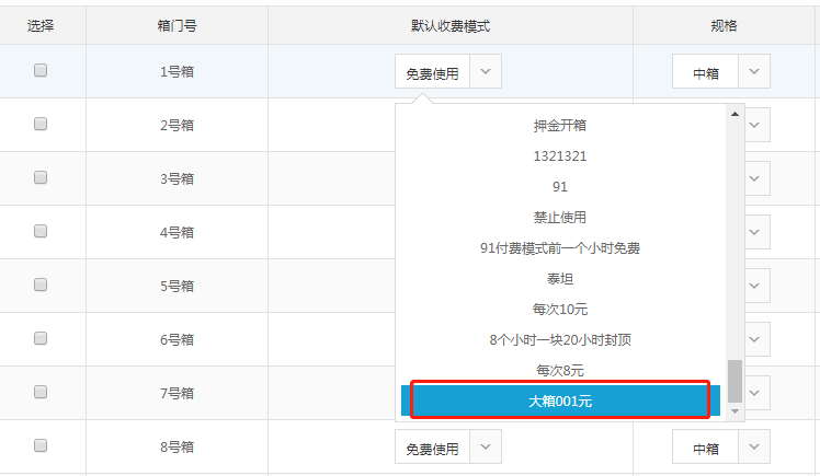 拉菜單,可以看到我們之前設置的收費模式“大箱 001元”,按照此方法可以設置其