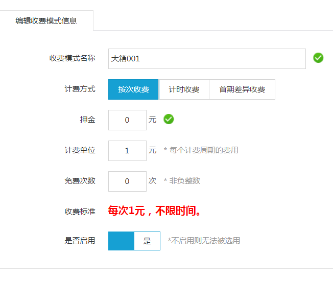 2) 這里我們以按次收費方式為例,設置收費模式參考如下: