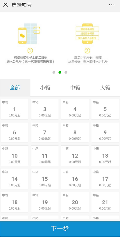 2)點擊“存物”按鈕后,掃屏幕二維碼即可進入選箱界面(如圖1-2),選擇箱門號,點擊下一步,根據(jù)頁面提示并打開箱門,存入物品后請隨手關門。